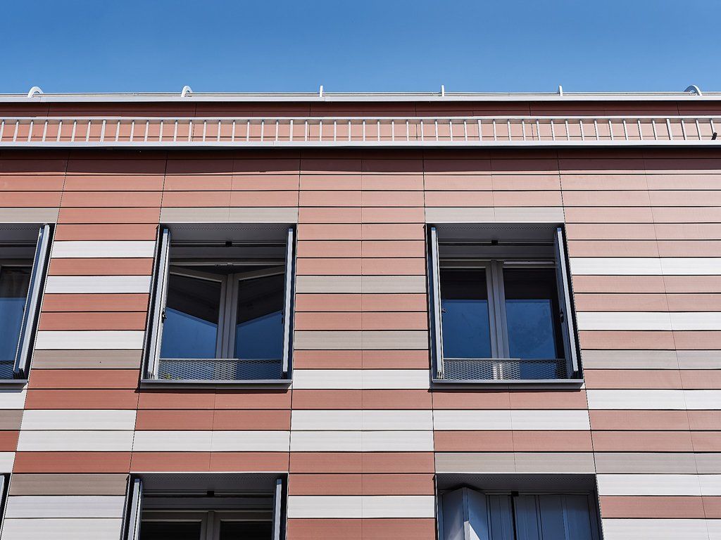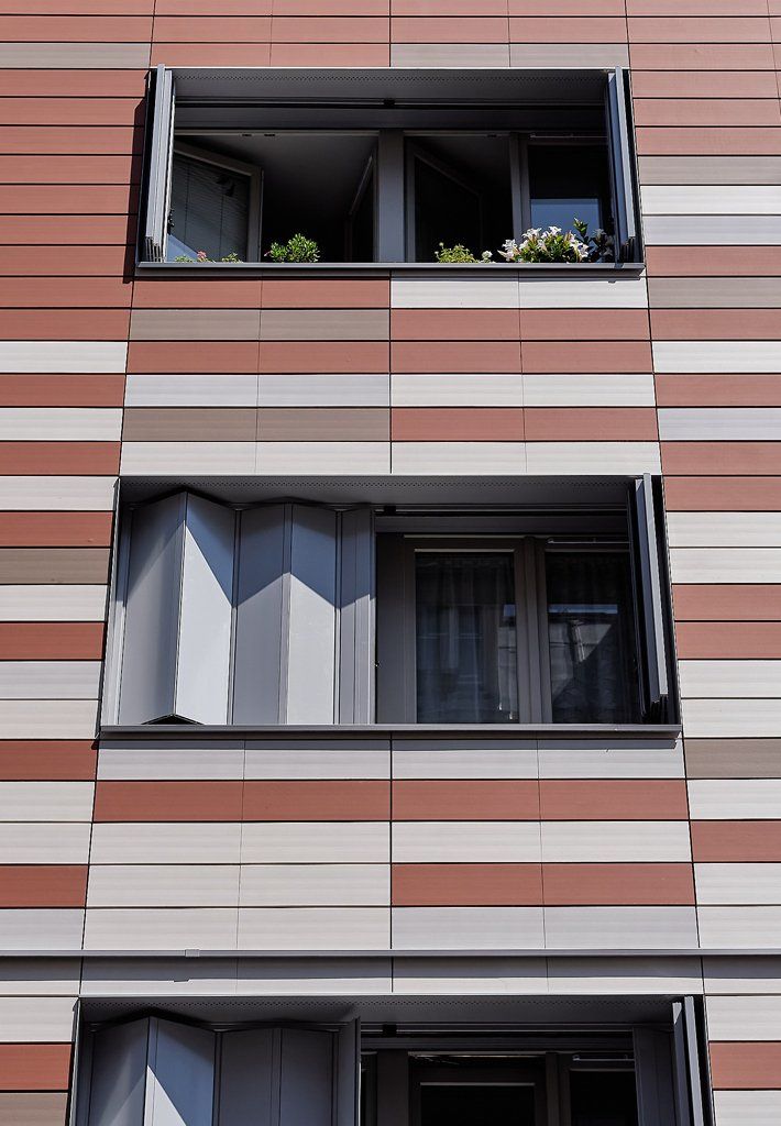 Du fait de l’orientation Sud-Ouest de la façade principale, qui ne compte aucun système d’occultation, le projet prévoit la pose d’un bardage qualitatif modernisant la façade, ainsi que la mise en place de «système» de baie comptant la fenêtre, les volets à pantographe et un garde-corps intégré. La performance du projet amène la consommation énergétique de 153 à 75 kWh.ep/m²/an.